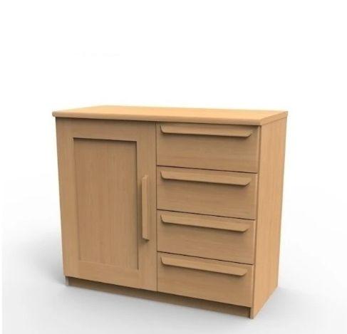 Komoda je vyrobena z dubu. Můžete u nás zakoupit i v bukovém provedení s možnost výběru moření. Komoda je praktická díky tomu, že má i zásuvky a v druhé části dvířka. Pro výrobu komody je použit velmi kvalitní materiál o síle 25/19 mm.